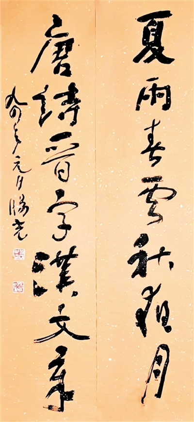 旸光先生淵博的家學(xué),深厚的學(xué)養(yǎng)為其書法技藝開掘出流淌不盡的源泉,正是他那非凡的經(jīng)歷與盤踞胸中的郁勃之氣,鑄就了別具一格的藝術(shù)風(fēng)采?v觀先生書法字里行間的布局、結(jié)構(gòu)、章法,即可以領(lǐng)略其高深的藝術(shù)修養(yǎng)。一般書法家給自己作品題款尚膽怯,更何況給山水畫人物、花鳥畫題款署名,書寫跋語,要求書者不但有深厚的文學(xué)功底賦詞作詩,再根據(jù)畫面的風(fēng)格,畫中所留空白虛實照應(yīng),用筆用墨的變化去應(yīng)對,好的款跋使作品升華。而先生無論行、草、隸、篆,縱橫涂抹,信手拈來如行云流水,宛若天成,令人折服,先生曾為不少后學(xué)作品撰寫款名,跋語至今記憶猶新。