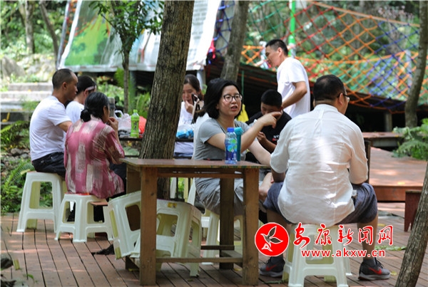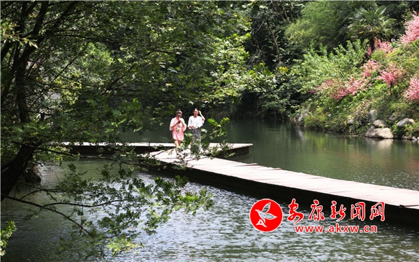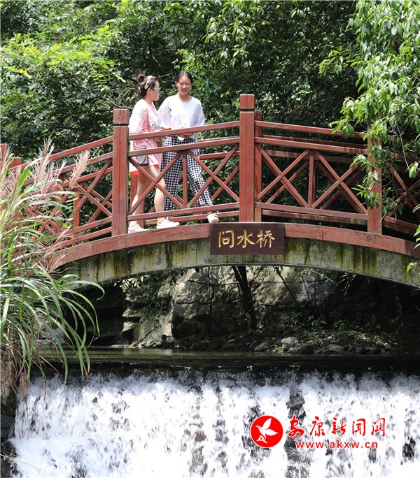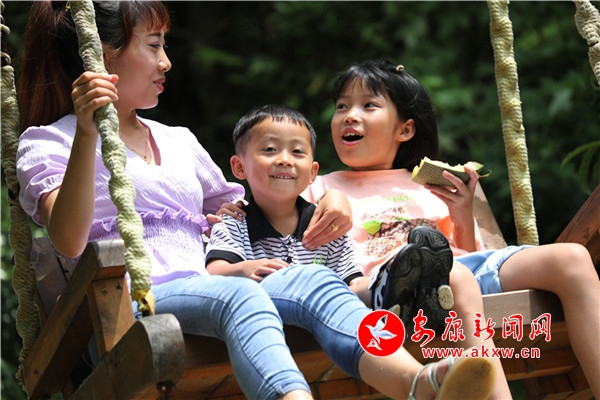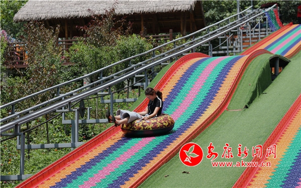 往來翕然,游人如織。幾個(gè)稚童像百靈般迅捷,雀躍的身影在青竹翠蔓間穿梭,很快便隱沒了身形,只余下串串清脆的歌聲,與林間蟬鳴一唱一和。妙齡姑娘,隨性地從五彩滑道旋轉(zhuǎn)直下,如履云端,恍若驚鴻。柔情脈脈的戀人,安享著山澗的幽靜,互訴衷腸,期冀著美好的未來。