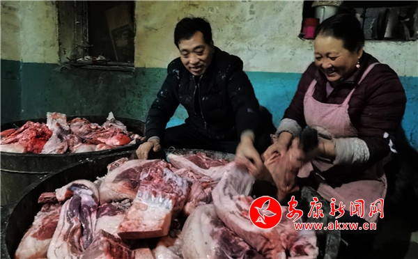 當(dāng)天,張成凱家一口氣殺了6頭豬,約1200斤,收入3萬多元;張秀柱家殺了2頭豬,400余斤,收入約1萬元。