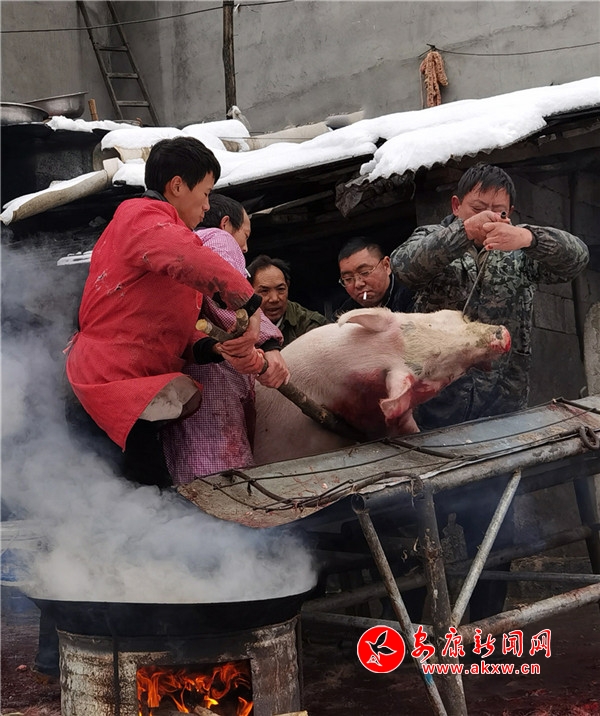 時(shí)逢陰歷十月初九,鎮(zhèn)坪縣迎來了入冬以來第一場降雪。漫天大雪,給原本氣溫偏低的化龍山腳下的張家坪增添了寒冷。然而,上竹鎮(zhèn)化龍村8組村民張成凱和叔叔張秀柱,卻帶著家人熱火朝天地忙著殺豬腌制臘肉,絲毫沒有寒冷的感覺。
